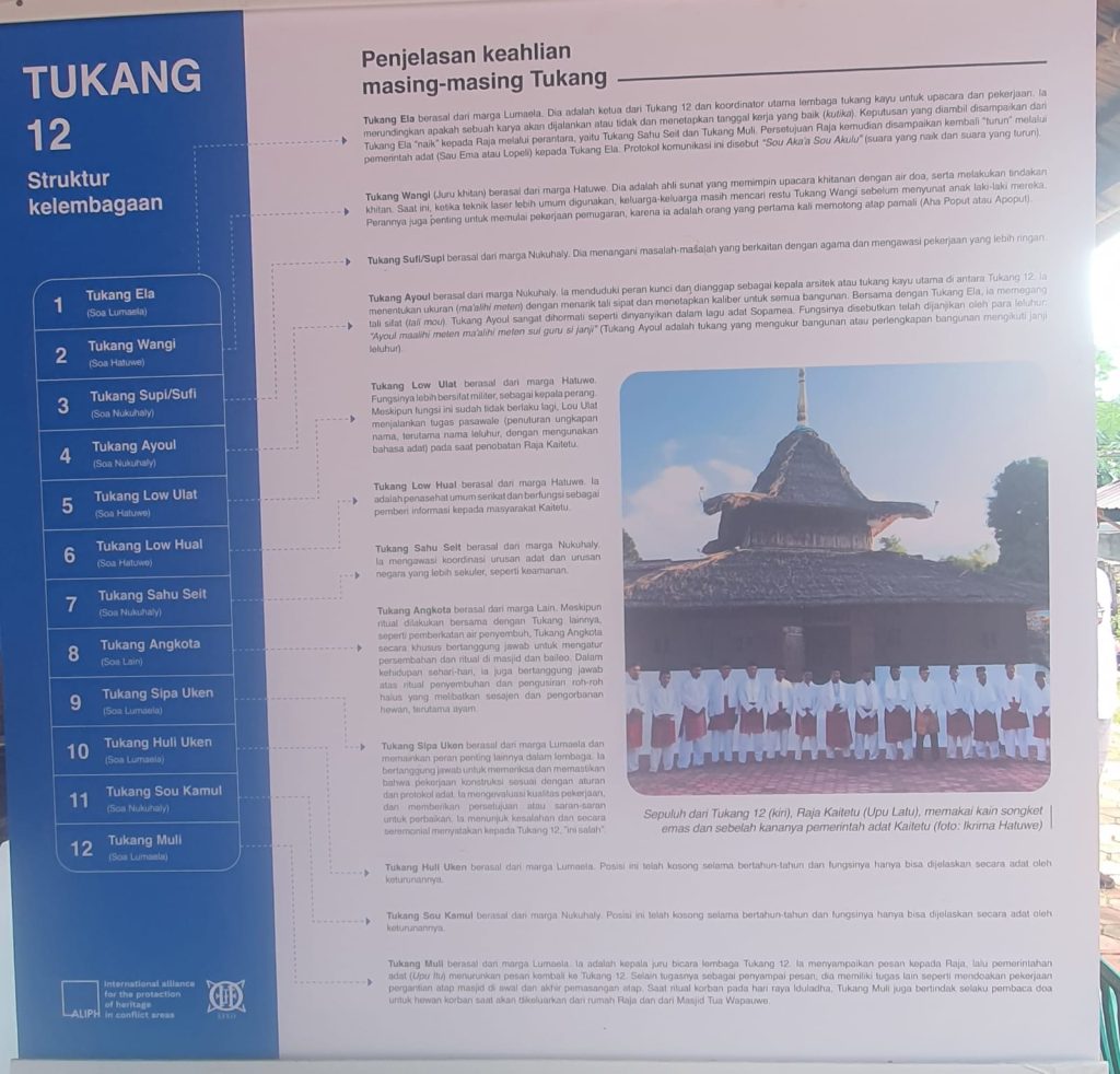 Papan informasi tentang Tukang 12 memperlihatkan hal yang lebih dalam. Di sana dijelaskan adanya dua belas posisi kelembagaan adat yang memiliki fungsi masing-masing: Tukang Ela, Tukang Wangi, Tukang Supi/Sufi, Tukang Ayoul, Tukang Low Ulat, Tukang Low Hual, Tukang Sahu Seit, Tukang Angkota, Tukang Sipa Uken, Tukang Hulu Uken, Tukang Sou Kamul, dan Tukang Muli. Masing-masing terkait dengan soa atau marga tertentu, seperti Lumaela, Hatuwe, Nukuhaly, dan soa lainnya. Ini menunjukkan bahwa masjid tidak hanya dikelola melalui struktur keagamaan formal, tetapi juga melalui tata kelola adat.
