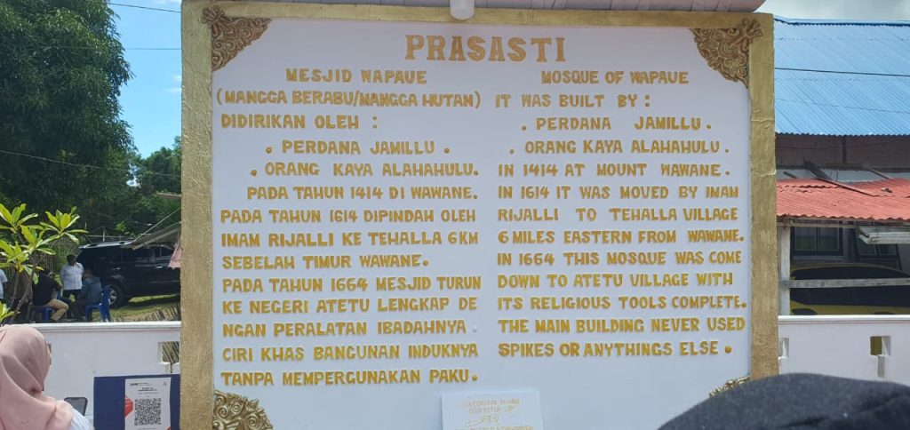 Prasasti di kompleks Masjid Wapauwe mencatat bahwa masjid ini, yang juga disebut Mesjid Wapauwe atau Mangga Berabu/Mangga Hutan, didirikan oleh Perdana Jamillu dan Orang Kaya Alahahulu pada tahun 1414 di Wawane. Pada tahun 1614, masjid dipindahkan oleh Imam Rijalli ke Tehala, sekitar enam kilometer sebelah timur Wawane. Lalu pada tahun 1664, masjid turun ke Negeri Atetu lengkap dengan peralatan ibadahnya. Prasasti itu juga menegaskan ciri utama bangunan induknya: “tidak menggunakan paku”.